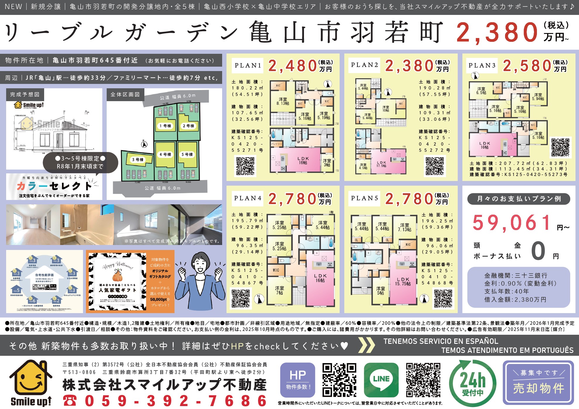 亀山市羽若町の開発分譲地内の新築4~5LDK・全5棟が新登場!